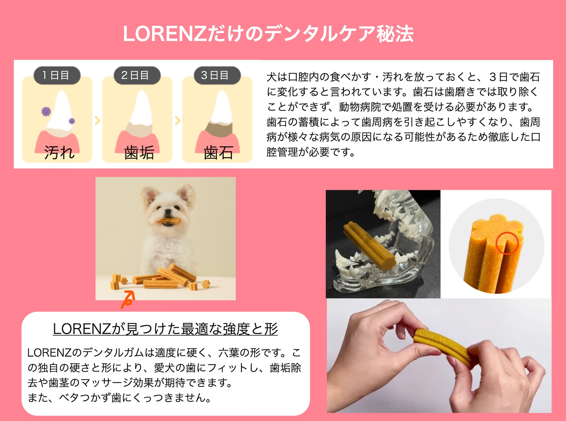 合成添加物不使用!肉類不使用で低アレルゲン、タンパク質制限のある愛犬にもおすすめ。LORENZ独自のデンタルケア秘法で愛犬の歯にフィットし、歯垢除去や歯茎のマッサージに最適。にんじんは目の健康と骨・関節強化に最適な原材料を使用しています。